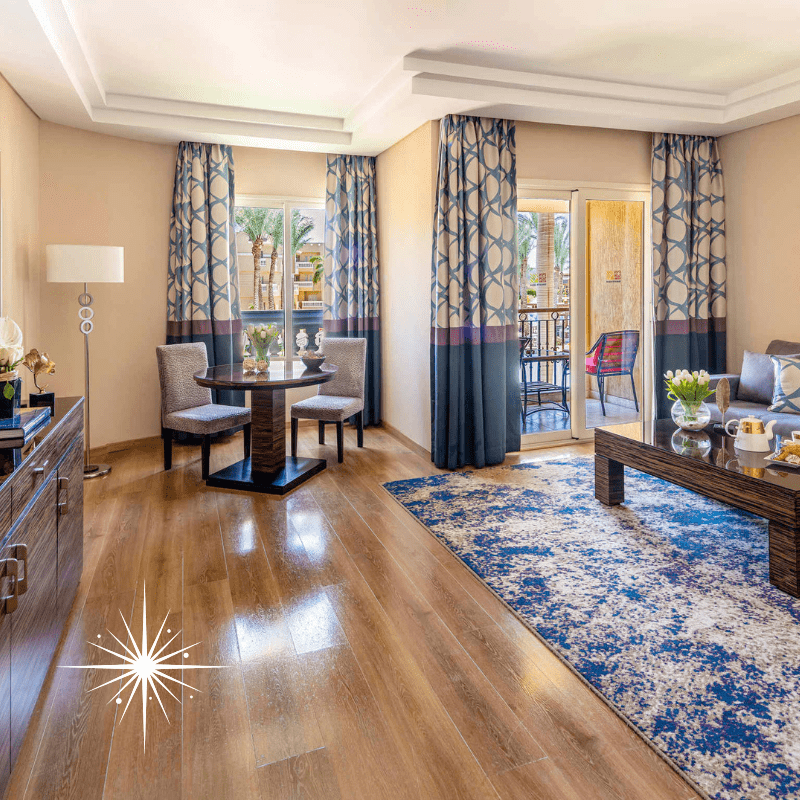 The Deluxe Suite Aqua at Rixos Seagate Aqua offers an exquisite retreat perfectly designed for families or groups seeking a luxurious getaway. This spacious suite, boasting an impressive area of 124 square metres (1,334 square feet), features both a King room and a Twin room, comfortably accommodating up to six guests. With a stylish living area, the suite is equipped with modern amenities, including a fully stocked mini-bar, tea and coffee-making facilities, and IPTV screens for entertainment. The three bathrooms ensure convenience and privacy for all guests, while the balcony offers a splendid view of the inviting pool below.